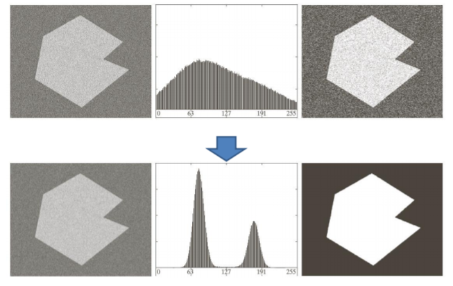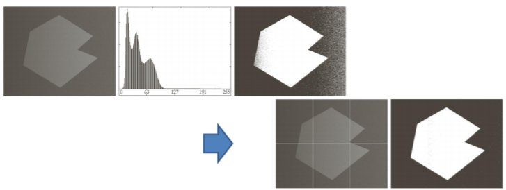 - 배경영역과 물체영역 내의 밝기값이 단조롭다.(차이가 별로 없다.)
