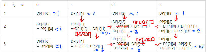즉, 점화식으로 표현한다면 DP[K][N] = DP[K-1][0] + DP[K-1][1] + … + DP[K-1][N] 일 것이다.