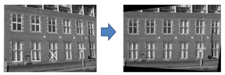 비스듬이 촬영된 사진을 마치 정면에서 촬영한 것처럼 변환시킬 수 있다. (반대도 가능)