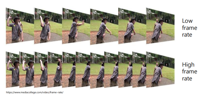동일한 대상을 촬영할때, frame rate가 높은것이 눈에 자연스럽게 보이지만, 초당 존대하는 영상의 수가 많기 때문에 데이터양이 증가하는 단점이 있다.