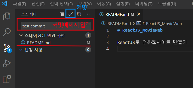 3) 변경사항 위의 칸에 커밋할 메세지 입력 후 '체크' 버튼을 눌러 commit한다.