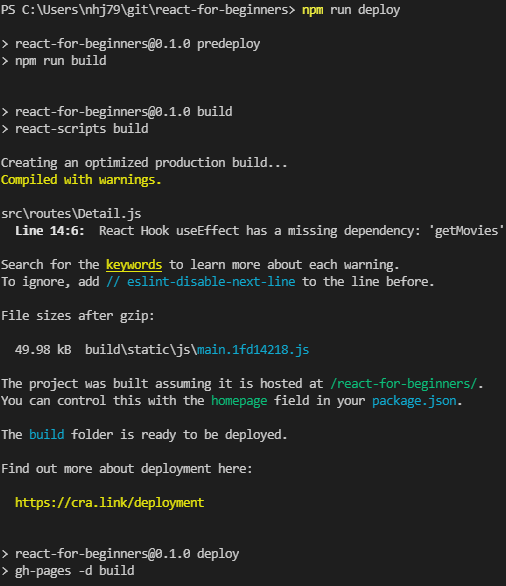 package.json 파일의 수정이 다 되었다면 터미널에서 npm run deploy를 실행시킨다.